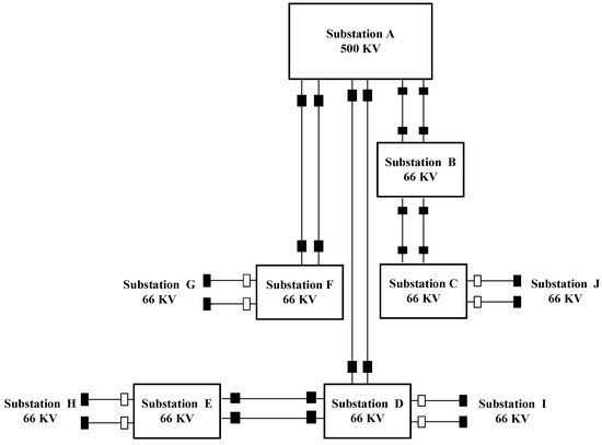 Figure 8 presents a block diagram demonstrating the electrical power transmission substations within the Middle Egypt Electricity Zone under study. Figure 9 shows the Simulink model of the electrical transmission network operating at 66 KV and 525 MVA. The apparent power of the system is 525 MVA, with the load apparent power limited to a maximum of 85% of its rated capacity, equating to 446.25 MVA, to ensure the safe operation of the power transformers and prevent system overload.