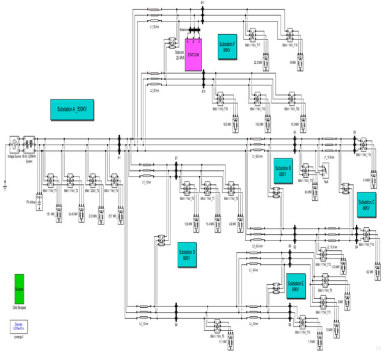 The system integrates STATCOM with a fuzzy logic controller. The evaluation was conducted under multiple abnormal conditions. The system comprises electrical power transmission substations located in the Middle Egypt Electricity Zone, such as substation A (500 KV), which is considered the main substation of the proposed system, substation B (66 KV), substation C (66KV), substation D (66 kV), substation E (66 KV), and substation F (66 KV). All the 66 KV transmission substations are supplied from substation A (500 KV transmission substation). The STATCOM of 25-MVA and 66 KV was connected to the shunt at bus B11. The power system voltage was adjusted to (±10%) of the nominal value utilizing a three-phase variable voltage source in accordance with the simulation timeline, as presented in Table 2. Table 3 lists the data parameters of the system, and STATCOM in the model under study.