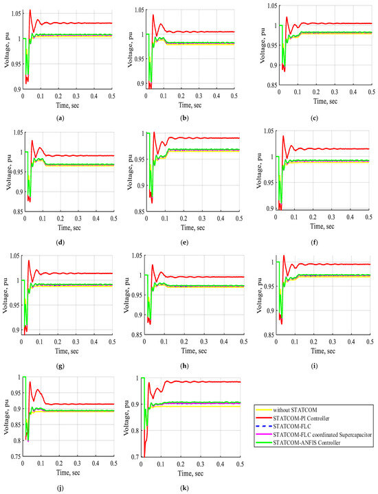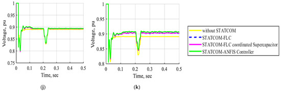 - Case 2: The electrical network under voltage variation without STATCOM, with STATCOM-PI controller, with STATCOM-FLC, with STATCOM-FLC coordinated supercapacitor, and with STATCOM-ANFIS controller.