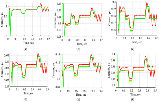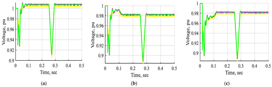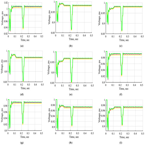 Figure 22 and Figure 23 display the voltage and current waveforms of bus B1 to bus B11 without STATCOM, with STATCOM-FLC, with STATCOM-FLC coordinated supercapacitor, and with STATCOM-ANFIS controller under a three-line-to-ground fault inserted near bus B3. The waveforms demonstrated significant variations in voltage and current during the interval from t = 0.2 s to 0.21 s, associated with a three-line-to-ground fault near bus B3. The figures demonstrate that the voltage and current waveforms from bus B1 to bus B11 during a three-phase line-to-ground fault near bus B3 were significantly improved when utilizing a STATCOM with an ANFIS controller, compared to fuzzy controllers or non-FACTS devices. The STATCOM-ANFIS controller system demonstrated a shorter stabilization time compared to other systems during a three-line-to-ground fault. The system’s stability under fault conditions is improved by implementing a STATCOM utilizing an ANFIS controller.