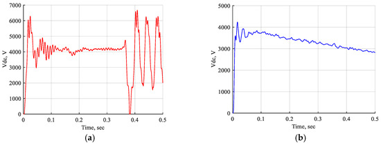 The DC voltage waveform of one STATCOM unit and two STATCOM units coordinated with the ANFIS controller for a three-line-to-ground fault near bus B3 at t = (0.2–0.21) s. (a) The DC voltage waveform of one STATCOM unit with ANFIS controller. (b) The DC voltage waveform of two STATCOM units with ANFIS controller.