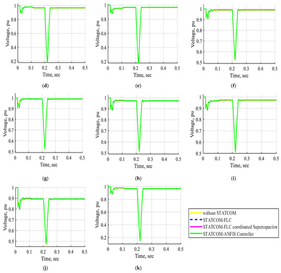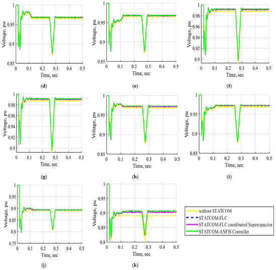 The voltage waveform of buses B1, B2, B3, B4, B5, B6, B7, B8, B9, B10, and B11 in pu without STATCOM, without STATCOM, with STATCOM-FLC, with STATCOM-FLC coordinated supercapacitor, and with STATCOM-ANFIS controller for three-line-to-ground fault near bus B3 at t = (0.2–0.21) s. (a) The voltage waveform of bus B1 in pu. (b) The voltage waveform of bus B2 in pu. (c) The voltage waveform of bus B3 in pu. (d) The voltage waveform of bus B4 in pu. (e) The voltage waveform of bus B5 in pu. (f) The voltage waveform of bus B6 in pu. (g) The voltage waveform of bus B7 in pu. (h) The voltage waveform of bus B8 in pu. (i) The voltage waveform of bus B9 in pu. (j) The voltage waveform of bus B10 in pu. (k) The voltage waveform of bus B11 in pu.