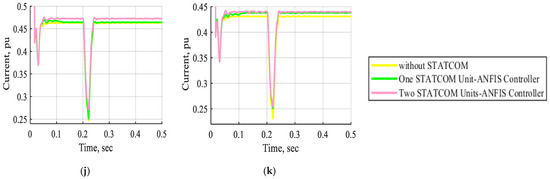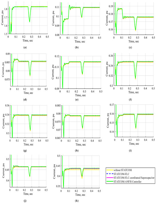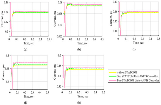 The current waveform of buses B1, B2, B3, B4, B5, B6, B7, B8, B9, B10, and B11 in pu without STATCOM, with one STATCOM unit, and with two STATCOM units coordinated with an ANFIS controller at normal operation. (a) The current waveform of bus B1 in pu. (b) The current waveform of bus B2 in pu. (c) The current waveform of bus B3 in pu. (d) The current waveform of bus B4 in pu. (e) The current waveform of bus B5 in pu. (f) The current waveform of bus B6 in pu. (g) The current waveform of bus B7 in pu. (h) The current waveform of bus B8 in pu. (i) The current waveform of bus B9 in pu. (j) The current waveform of bus B10 in pu. (k) The current waveform of bus B11 in pu.