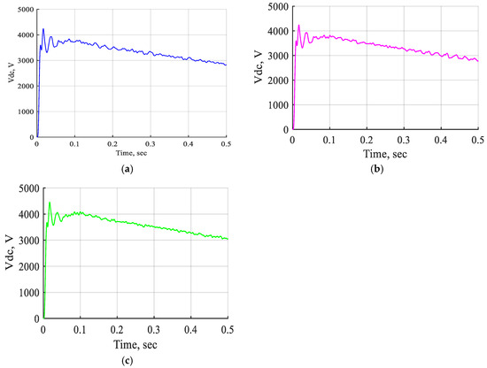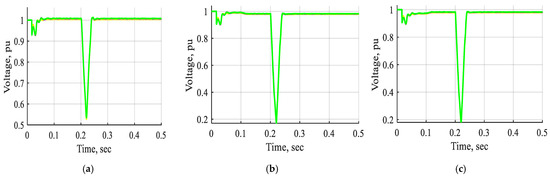 The DC voltage wave shapes of STATCOM-FLC, STATCOM-FLC coordinated supercapacitor, and STATCOM-ANFIS controller for single line-to-ground fault near bus B3 at t = (0.2–0.21) s. (a) The DC voltage wave shape of STAT-COM-FLC. (b) The DC voltage wave shape of STAT-COM-FLC coordinated supercapacitor. (c) The DC voltage wave shape of STATCOM-ANFIS controller.