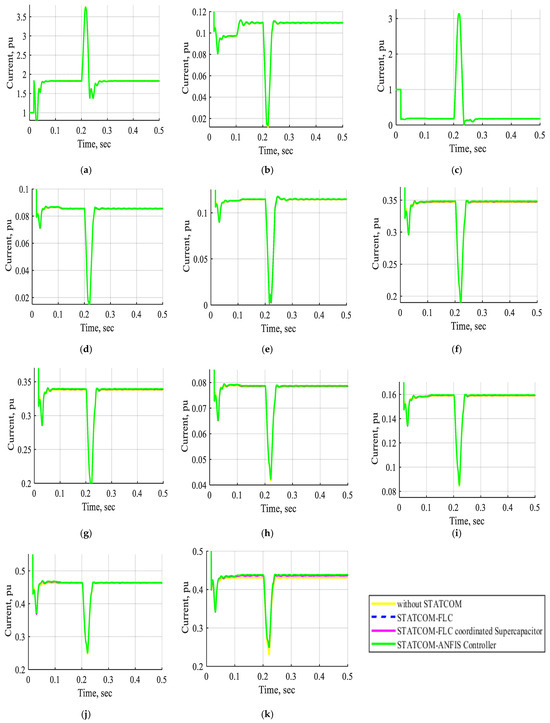 The current waveform of buses B1, B2, B3, B4, B5, B6, B7, B8, B9, B10, and B11 in pu without STATCOM, without STATCOM, with STATCOM-FLC, with STATCOM-FLC coordinated supercapacitor, and with STATCOM-ANFIS controller for three-line-to-ground fault near bus B3 at t = (0.2–0.21) s. (a) The current waveform of bus B1 in pu. (b) The current waveform of bus B2 in pu. (c) The current waveform of bus B3 in pu. (d) The current waveform of bus B4 in pu. (e) The current waveform of bus B5 in pu. (f) The current waveform of bus B6 in pu. (g) The current waveform of bus B7 in pu. (h) The current waveform of bus B8 in pu. (i) The current waveform of bus B9 in pu. (j) The current waveform of bus B10 in pu. (k) The current waveform of bus B11 in pu.