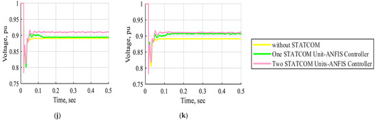 - Case 3: The electrical network under voltage reduction without STATCOM, with STATCOM-FLC, with STATCOM-FLC coordinated supercapacitor, and with STATCOM-ANFIS controller.