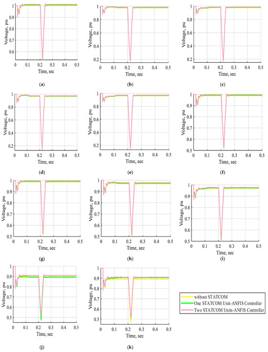 The voltage waveform of buses B1, B2, B3, B4, B5, B6, B7, B8, B9, B10, and B11 in pu without STATCOM, with one STATCOM unit, and with two STATCOM units coordinated with an ANFIS controller for a three-line-to-ground fault near bus B3 at t = (0.2–0.21) s. (a) The voltage waveform of bus B1 in pu. (b) The voltage waveform of bus B2 in pu. (c) The voltage waveform of bus B3 in pu. (d) The voltage waveform of bus B4 in pu. (e) The voltage waveform of bus B5 in pu. (f) The voltage waveform of bus B6 in pu. (g) The voltage waveform of bus B7 in pu. (h) The voltage waveform of bus B8 in pu. (i) The voltage waveform of bus B9 in pu. (j) The voltage waveform of bus B10 in pu. (k) The voltage waveform of bus B11 in pu.