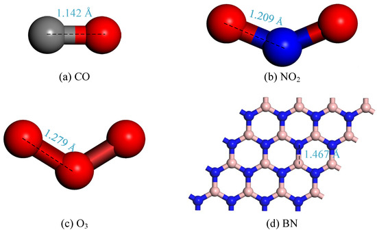 Figure 1 displays the geometrically refined structures of pristine BN and three notable fault gases typically found in secondary equipment within substations. For this study, we focused on carbon monoxide (CO), nitrogen dioxide (NO2), and ozone (O3) as the primary gases indicative of faults in such equipment. The molecular configurations for these gases are presented in Figure 1a–d. Specifically, CO exhibits a linear molecular form, whereas both NO2 and O3 share similar characteristics, featuring planar symmetric structures. Prior to gas adsorption, the C-O bond length is the shortest at 1.142 Å, in contrast to the N-O and O-O bond lengths in the NO2 and O3 molecules, which are 1.209 Å and 1.279 Å, respectively. BN, on the other hand, possesses a two-dimensional hexagonal lattice reminiscent of pristine graphene, with evenly spaced B and N atoms, and a B-N bond length of 1.467 Å, as illustrated in Figure 1d.