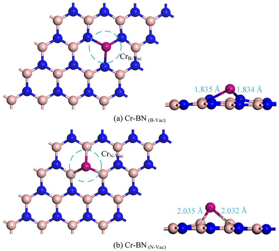 To enhance the performance of BN, this study introduces Cr doping for modification. During the Cr modification process, multiple potential sites are available. Two doping sites in the defect modification process were selected for structure and energy optimization. The optimized results are presented in Table 1 and Figure 2a,b, where Cr-BN(B-Vac) and Cr-BN(N-Vac) represent Cr-doped BN after modification with B and N defects, respectively. The columns show the modified energy (Emod) and the charge on Cr (QCr).