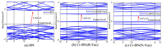 The electronic band structures provide insights into a material’s electronic properties. To gain an understanding of the electronic behavior of the material following Cr doping modification, we computed the band structures of both pristine BN and BN modified with two distinct types of Cr doping, as depicted in Figure 3. Our findings show considerable changes in the band structures before and after doping, suggesting low effective masses for electrons. Prior to the introduction of metal particles, BN exhibits a substantial band gap of 4.561 eV, which is characteristic of a typical semiconductor. However, upon substituting B and N atoms with Cr particles, the band gap values diminish to 1.924 eV and 0.971 eV, respectively. This demonstrates a profound effect of doping on the material’s band gap, primarily due to the influence of the 4d orbital electrons of Cr atoms.