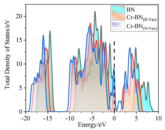 In this study, we employed the density of states (DOS) theory and differential charge density surface analysis to delve deeper into the alterations in the electronic properties of BN before and after doping, as presented in Figure 4 and Figure 5, respectively. Figure 4 demonstrates that, although the overall distribution of the total DOS remains largely unchanged before and after doping, the introduction of Cr dopant atoms introduces certain modifications to the system’s total DOS. Specifically, the total DOS for both Cr-doped BN materials shifts slightly towards the left when compared to pristine BN, accompanied by a minor reduction in the electron count on both sides of the Fermi level. Based on the band structure after Cr doping, we hypothesize that under the influence of the dopant, the electrons gradually move from the lower end of the conduction band to the upper end of the valence band, which leads to a decrease in the overall resistivity of the system and an increase in the electronic conductivity of the crystal. Furthermore, the emergence of additional small peaks in the total DOS after doping hints at a significant impact of Cr atom doping on the electronic behavior of pristine BN, introducing more activated states within the material.