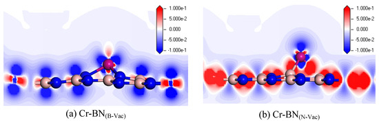 The differential charge density (DCD) analysis before and after doping was also conducted, as illustrated in Figure 5. In this figure, red and blue hues signify an increase and decrease in charge density, respectively, with a color scale spanning from −0.1 e/Å to 0.1 e/Å. Notably, there are distinct areas of electron depletion and electron accumulation surrounding Cr atoms and BN units, indicating that charge transfer predominantly takes place between Cr and BN. Additionally, the arrangement of these electron depletion and accumulation regions in proximity to Cr atoms varies between the two materials obtained through different doping techniques. This variation confirms that Cr assumes different roles in the electron donor–acceptor relationship under distinct doping methods, aligning with our previous analysis of charge transfer outcomes.