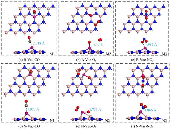 Once the optimized doping structure was secured, models were developed to simulate the adsorption of three target gases onto the surfaces of two doped materials. The adsorption energy Eads, defined by Equation (2), serves as a metric to quantify the interaction strength between the target gas molecules and the adsorbent surface.