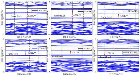 Figure 7 displays three distinct band structures resulting from the adsorption of fault gases from substation secondary equipment onto two varieties of Cr-BN, providing a comprehensive understanding of the information on the electronic structure of the system.