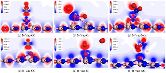 In this section, we develop models for the adsorption of target gases onto the materials under investigation. The most stable configurations of these adsorption systems were determined based on various criteria, as depicted in Figure 6. The adsorption energy, adsorption distance, and charge transfer values are summarized in Table 2. Specifically, Figure 6 M1–M3 and N1–N3 display the most stable adsorption structures for three target gases on Cr-BN(B-Vac) and Cr-BN(N-Vac), respectively. These figures reveal distinct adsorption behaviors of the two materials towards the three fault gases emanating from secondary equipment in substations. Our findings indicate that both Cr-BN(B-Vac) and Cr-BN(N-Vac) undergo notable surface reactions with the target gas molecules, accompanied by a subtle curvature change on the BN surface. Furthermore, the adsorption capacity of these materials for the fault gases follows the sequence: O3 > NO2 > CO, with corresponding adsorption energies of −4.452 eV, −2.576 eV, and −1.029 eV for Cr-BN(B-Vac) and −8.577 eV, −3.024 eV, and −1.550 eV for Cr-BN(N-Vac). The adsorption mechanisms are categorized as physicochemical in nature. Notably, during O3 adsorption, chemical bond cleavage occurs, forming Cr-O bonds with high adsorption energies of −4.452 eV and −8.577 eV for the two materials, respectively, showcasing their robust adsorption capability for O3. Additionally, from a geometric structure perspective, CO and NO2 molecules undergo activation during adsorption, with elongated C-O and N-O bond lengths compared to their pre-adsorption states, primarily due to weak van der Waals interactions. In terms of charge transfer, all target gases except CO function as electron donors during the surface reaction, with the amount of charge transfer correlating with the adsorption strength. Consequently, Cr-modified BN exhibits a robust gas-sensing response. The adsorption of Cr-BN on the three target gases mainly tends to be chemisorption accompanied by chemical bond breaking.