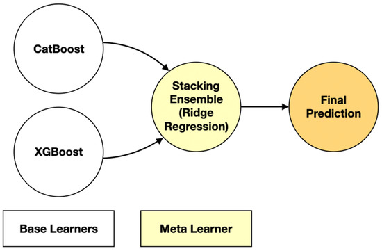 Once the augmented dataset was established, a stacking ensemble learning approach was adopted to enhance predictive accuracy. XGBoost and CatBoost were selected as base learners due to their robustness in small datasets, their ability to handle nonlinear relationships, and their effective feature selection mechanisms. XGBoost, a gradient boosting framework optimized for structured data, was fine-tuned using Bayesian Optimization to determine the optimal hyperparameters. Meanwhile, CatBoost, recognized for its efficient handling of categorical features and ordered boosting strategy, was employed to complement XGBoost by mitigating overfitting tendencies. The outputs from both models were then aggregated through a Ridge regression meta-learner, forming a stacked ensemble framework designed to improve generalization and minimize prediction errors.