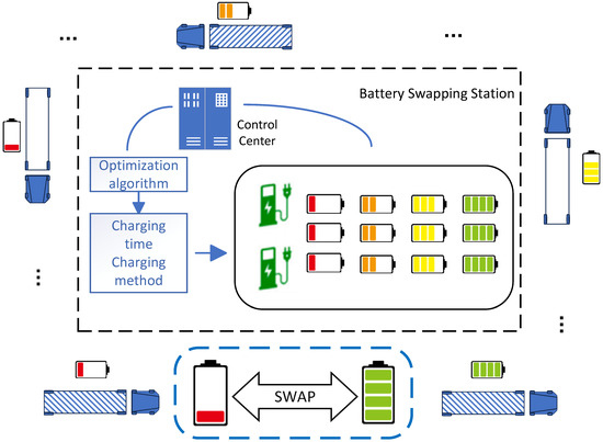 However, in the field of EHTs, the problems of mileage anxiety and long charging time are even more serious. Currently, the primary feasible solutions to address these issues are Fast Charging (FC) and Battery Swapping (BS) [5]. FC means that the batteries and HTs are one and the same, and vehicles with Depleted Batteries (DBs) can enter Battery Charging Stations (BCSs) for fast charging using a high C-rate, and continue to run after charging is complete. This approach can greatly reduce the replenishment time, but due to limitations in battery material characteristics and charger power, the charging replenishment of EHTs still falls short compared to the replenishment of gas stations; at the same time, FC will cause serious losses to the batteries, and the batteries in EHTs usually have a large rated capacity, which represents a hard-to-afford high cost. An alternative strategy is the use of a Battery Swapping Mode (BSM). Under BSM, the battery is separated from the EHT, and the same battery can be used to support the operation of different EHTs. In the BSS, EHTs can replace a DB with a Fully Charged Battery (FCB) in a few minutes and can continue to operate after completing the replacement; the removed DB is assigned by the BSS to be charged, and after being fully charged, it participates in the exchange as a FCB once more, realizing the separation of the battery charging process and the operation process of EHTs. The centralized management of batteries at the BSS can enhance battery lifespan, while regulated charging at the BSS alleviates stress on the power grid. Furthermore, research has indicated that BSM demonstrates significant competitiveness in both the economic and technological aspects.