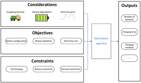 Over the past 20 years, BSSs have become a hot topic as a new type of energy supplement to support EVs. In 2011, the Better Place network deployed the first advanced commercial BSSs in Israel and Denmark. However, the substantial initial investment and ongoing operating costs associated with BSSs have hindered their widespread implementation and use. As a result, reducing the operational costs associated with BSSs has become a critical issue. With the development of EVs and battery technologies, many studies have been conducted to optimize the operating costs of BSSs, and most propose different scheduling models for BSS operation and apply corresponding optimization algorithms to solve the problem. Numerous studies have proposed various models for the operation of BSSs and employed appropriate algorithms to address this challenge, as demonstrated in [8,9,10]. The optimization of BSS operations can be categorized into three different types, namely, static optimization, sequential decision optimization, and multi-objective optimization, based on the specific objectives of the decision-making process. Table 1 provides a summary of the relevant studies on BSSs and their key findings.