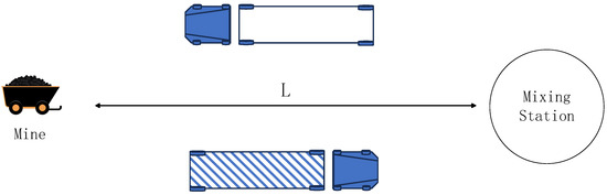 The BSS is incorporated into the transportation route. Thus we can simply consider the operation process as a bi-directional route from the mine to the mixing plant, while splitting the route into loaded and unloaded states. Based on the energy consumption in different load states, the number of trips a single battery swapping operation can complete, r, is calculated. Let L and K represent the round trip length and fleet size, respectively. The battery capacity is denoted by R, and the battery performance is defined as e, which represents the distance that can be supported by one unit of electricity.