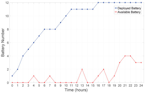 The relationship between changes in and is shown in Figure 4, where increases until it reaches the peak and fluctuates continuously with demand and FCB replenishment. In the initial period, the value increases, while the value stabilizes at zero. This indicates that, initially, the BSS lacked the batteries necessary for swapping and thus required configuration in advance. Concurrently with the completion of the charging process for the DBs after swapping, exhibits a gradual increase. Upon the arrival of the subsequent order, a fully charged battery is present in , resulting in . The BSS then proceeds to exchange this charged battery with the HT, maintaining the number of configured batteries constant, while simultaneously observing a decrease in . Eventually, the value reaches a maximum and stabilizes to represent the maximum required number of configured cells.
