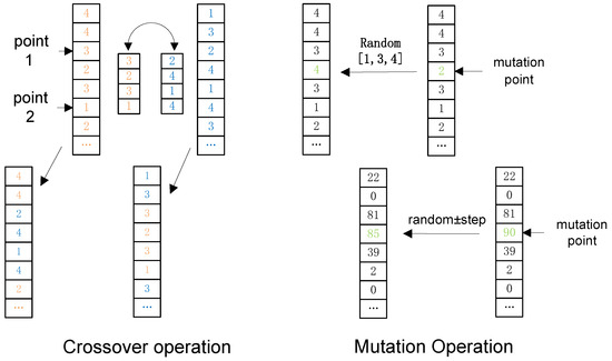 In the context of mutation operation, and implement single-point mutation and uniform mutation, respectively. Concurrently, a dynamic change step is introduced on the basis of uniform mutation. A larger step is employed at the inception of the iteration to expedite the search of the solution space. As the iteration progresses, the step undergoes a gradual reduction and transition to search for superior quality solutions. The enhanced operator operation is illustrated in Figure 5.