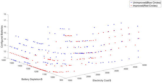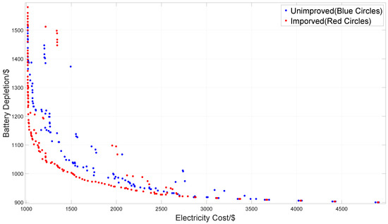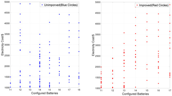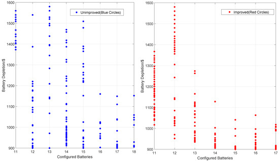 From the comparison of the F1–F2 population distribution shown in Figure 9, it can be seen that F1 and F2 are inversely related. This indicates that the more configured batteries there are, the slower the charging method the DB can adopt to reduce battery loss. Furthermore, the convergence effect of the improved results is significantly better than the unimproved results, and the objective function relationship is more obvious.