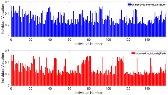 A comparison of the specific individual evaluation values is shown in Figure 11. The individual evaluation value is the weighted sum of the population individuals on the three objective functions; the smaller the individual evaluation value, the lower the cost of running the BSS and the better the individual performance. The maximum and minimum individual evaluation values of the unimproved algorithm are 0.5220 and 0.1925, respectively, and the maximum and minimum individual evaluation values of the improved algorithm are 0.5250 and 0.1658, respectively. In terms of the mean value, the average individual evaluation value of the unimproved algorithm is 0.31845, and that of the improved algorithm is 0.29087, which is optimized by 8.66% compared with the average individual evaluation value.