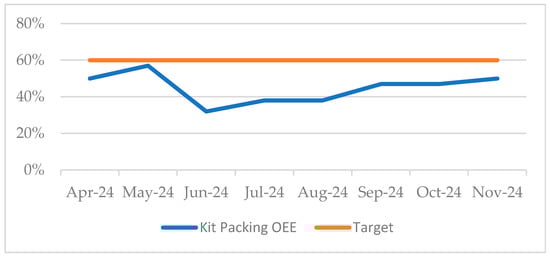 The kit packing department faces significant challenges when it comes to maintaining high Overall Equipment Effectiveness (OEE) due to frequent downtimes, primarily caused by material availability issues. These challenges have resulted in an OEE of less than 60% over the past few months, indicating a substantial amount of unproductive time. Operators in the department are often able to work effectively for only 2–3 h of their shift, leading to missed daily targets and late deliveries to customers. This inefficiency has also created a backlog of overdue orders, affecting both the kit packing and final packing departments, which rely on the timely supply of fitting kits to complete orders. The department consistently obtains OEE percentages below the targeted 85%, with specific monthly values such as 32%, 38%, and 47%, as depicted in Figure 1 below.