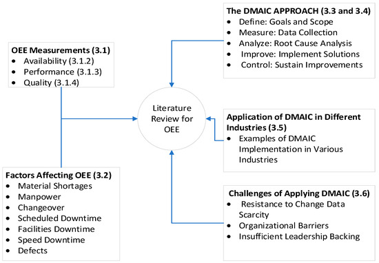 This section covers the fundamental concepts of OEE, as well as its three components: availability, performance, and quality. The DMAIC approach, which is utilized in this study, is also discussed. Figure 2 provides a schematic summary of the literature review. Section 3.1 and Section 3.2 provides a concise summary of the theoretical concepts and methodologies of OEE, while Section 3.3, Section 3.4, Section 3.5 and Section 3.6 cover practical case studies in which the DMAIC framework was used, aiming to provide directions for implementation grounded in this theory.