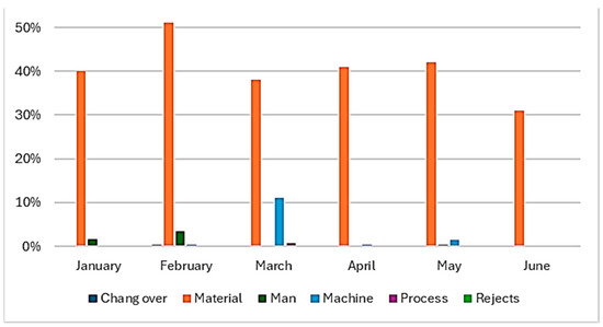 Data related to low OEE were collected, focusing on factors such as downtime, rejections, and other elements that influenced production. This project prioritizes downtimes, as they are the primary constraint preventing the production line from reaching its full production potential. Additionally, attainment data were examined to assess how close the department was to achieving its production targets. Historical and current downtime data were gathered from the company’s system, with daily attainment data collected throughout the research period (Figure 4). This figure shows that material-related issues (42.6%) were the main contributors to downtime, followed by machine failures (25.8%) and manpower issues (7.7%). By differentiating these categories, the study focuses on addressing material-related inefficiencies to improve Overall Equipment Effectiveness (OEE). It is evident from the graph that material-related issues consistently posed the biggest challenge for the department. Bai et al. [6] highlight that disruptions in material supply can lead to reduced throughput and operational inefficiencies, underscoring the importance of reliable material management systemization.
