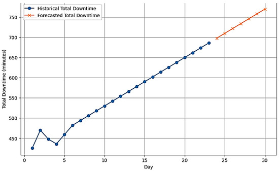 The model demonstrated a perfect fit with an R-squared value of 1.000, indicating that material and manpower downtimes fully explain the variability in total downtime. Using the regression model, we forecasted total downtime for the next seven days. The forecasted values were as follows: Day 24: 698 min, Day 25: 710 min, Day 26: 722 min, Day 27: 734 min, Day 28: 746 min, Day 29: 758 min, Day 30: 770 min.