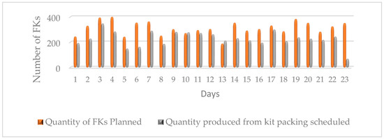 As an immediate countermeasure during the research process, the kit packing department was instructed to follow the production plan and document any factors which prevented them from fulfilling it. This allowed detailed data on material-related downtimes to be gathered; these data were further analyzed to address specific inefficiencies. Figure 8 analyzes the number of kits which went unpacked per week due to material-related issues. It shows that an average of 820 kits went unpacked per week, leading to an attainment of less than 40% per week in the department of kit packing.