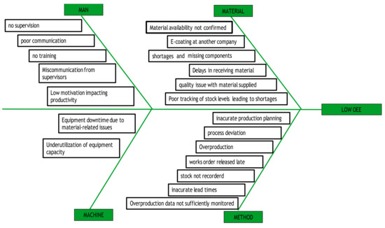 Table 2 presents the amount of downtime experienced during a shift. The available time per shift, excluding breaks and time spent cleaning up and 5S activities, was 405 min. By multiplying this figure by the two stations in operation, the total available time per shift was calculated and found to be equal to 810 min. The data reveal that the leading contributor to downtime is the “Material” category. These findings are consistent with research by Haque et al. [12], who emphasize that material shortages can severely restrict production capacity, impacting throughput and operational efficiency. However, labeling material as the major issue is too broad and does not allow the company to draw definitive conclusions. Further investigation was needed to identify the specific material-related issues contributing to downtime, providing a clear direction for focused investigation.