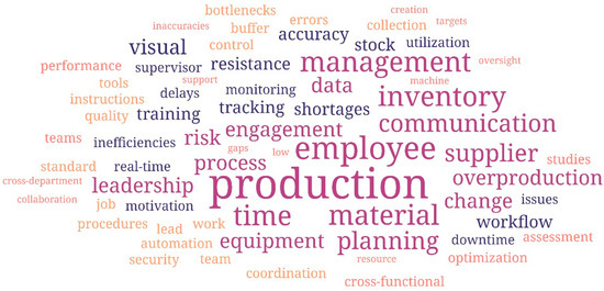 Beyond material and planning issues, workforce management and machine utilization also play critical roles in low OEE. A lack of supervision, driven by low job satisfaction and limited career development opportunities, contributes to inconsistent production oversight. Poor communication among supervisors and between departments further hinders operational efficiency, as real-time production updates are either delayed or not shared at all. Demotivation among staff due to frequent idle time, compounded by weak organizational culture and unsatisfactory working conditions, exacerbates productivity issues. Similarly, persistent equipment downtime, primarily due to material shortages, reflects inadequate risk assessment in supplier management and an absence of backup sourcing strategies. Without a structured, proactive approach to material planning, machines remain underutilized, failing to meet their theoretical production capacity. Implementing targeted interventions, such as training programs, leadership engagement initiatives, and improved production planning frameworks, will be essential in fostering a more efficient and resilient kit packing process. Figure 10 depicts a word cloud of the issues discovered during observations.