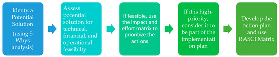 In this phase, we prioritize the solutions to the identified root causes, assessing which are most feasible to implement first, as it is not possible to execute all solutions simultaneously. The feasibility analysis for each proposed solution highlights the technical, financial, and operational considerations for implementation and whether each solution is feasible to implement. The feasible solutions will be prioritized, whereas those that are not will be considered for implementation at a later stage. The methodology followed in this phase is summarized below (Figure 11). Table 8 also shows the action plan developed throughout the methodology.