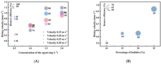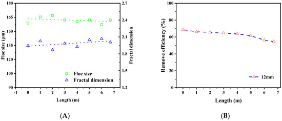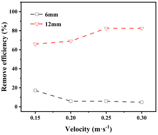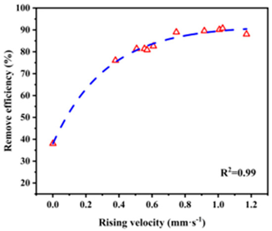 - The removal efficiency has a logarithmic relationship with the floc’s upward velocity. As the upward velocity increases from 0.1 mm·s−1 to 1.2 mm·s−1, the removal efficiency rises from 38% to 90%. Once the upward velocity exceeds 0.7 mm·s−1, the increase in removal efficiency levels off and converges at 90%.