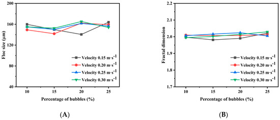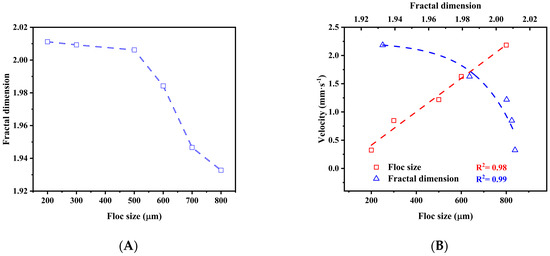 - The upward velocity of the flocs is correlated with the floc’s shape. Floc size has a linear correlation with upward velocity; as the floc size increases from 200 μm to 800 μm, the upward velocity increases from 0.4 mm·s−1 to 2.3 mm·s−1. The fractal dimension of the flocs has an exponential correlation with upward velocity; as the fractal dimension increases from 1.93 to 2.02, the upward velocity decreases from 2.3 mm·s−1 to 0.4 mm·s−1.