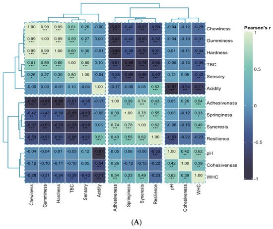 Cluster analysis was performed in both rows and columns, and the cluster tree diagram is shown in the heat graph. The purpose of clustering is to group indicators with similar patterns of correlation in order to better understand the relationships between variables. According to the grouping logic, Group 1 contains pH, Cohesiveness and WHC, Group 2 contains Adhesiveness, Springiness, Syneresis, and Resilience, and the remaining metrics are grouped into Group 3.