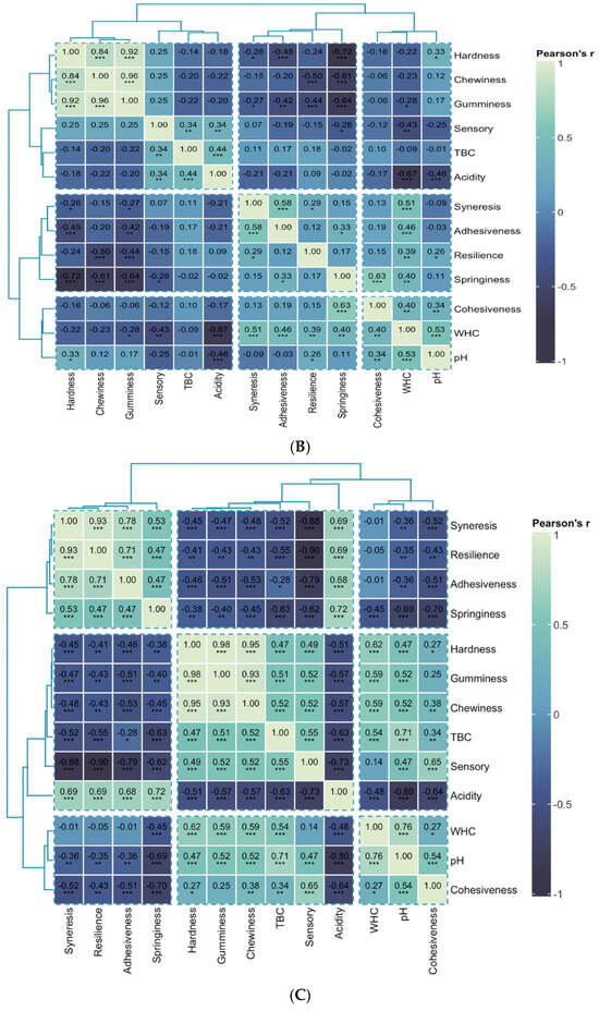(A) The Heatmap and Hierarchical Cluster Analysis (HCA) of the physicochemical, sensorial, and texture profile analysis (TPA) of the probiotic sheep yogurt; (B) The Heatmap and Hierarchical Cluster Analysis (HCA) of the physicochemical, sensorial, and texture profile analysis (TPA) of the probiotic cow yogurt; (C) The Heatmap and Hierarchical Cluster Analysis (HCA) of the physicochemical, sensorial, and texture profile analysis (TPA) of the probiotic blend yogurt.