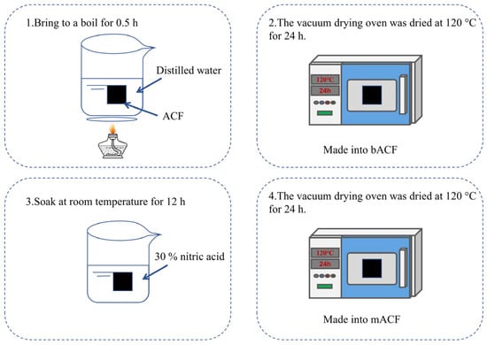 The unmodified ACF was cut into a square of 50 × 50 cm and boiled in distilled water for 0.5 h. After the water was taken out, it was dried in a vacuum oven at 120 °C for 24 h and sealed after natural cooling. The sample was marked as bare ACF (bACF). A certain amount of bACF was placed in a prepared 30% HNO3 solution and impregnated for 12 h at room temperature. The sample was taken out and dried in a vacuum drying oven at 120 °C for 24 h and sealed after natural cooling. The sample was labeled as modified ACF (mACF), as shown in Figure 1.