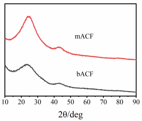 In order to explore the effect of nitric acid modification on the crystal structure of ACF, XRD was used to investigate the structural changes in ACF after modification. As shown in Figure 4, ACF belongs to amorphous carbon. Before and after nitric acid treatment, there are diffraction peaks at 2θ = 22° and 44° [30], and no new diffraction peaks exist. There is no significant change in the pattern compared to the unmodified ACF, indicating that the structure of ACF is not significantly affected during the preparation of nitric acid modification. The main peak is more prominent, and the diffraction peak position is slightly shifted to the left, which indicates that the crystallinity of ACF increases and the interplanar spacing increases. This change is due to the insertion of oxygen-containing functional groups into the ACF lattice during the modification process, resulting in a looser crystal structure but a more ordered arrangement. This structural adjustment increases the number of adsorption sites and improves their accessibility, making it easier for adsorbate molecules to reach the active sites. At the same time, the increase in crystallinity enhances the stability of adsorption sites.