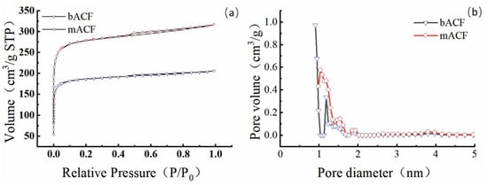 Table 1 shows that compared with bACF, the specific surface area of mACF increases, and the cumulative surface area of adsorption pores and desorption pores increases. However, the average pore size and adsorption and desorption pore size of ACF after nitric acid immersion treatment did not change significantly, indicating that new micropores were generated during the modification process. The pore structure of ACF has a certain stability, and it is not easy to be destroyed and expanded during the modification process. In the process of forming new micropores, they have not been obviously pulled or squeezed, and the pore size is relatively stable. At the same time, nitric acid immersion only acts on the surface of ACF during the modification process. Acid etching and the introduction of functional groups did not cause obvious erosion and expansion of the pore wall, so the pore size remained basically unchanged.