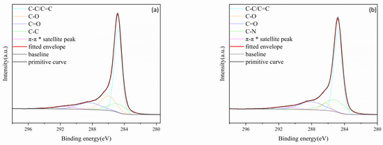 Before modification, as shown in Figure 8a, the main characteristic peak of the carbon element is C–C/C=C, indicating that the unmodified sample is mainly in the graphitized carbon structure, and the surface oxygen-containing functional groups are less. After modification, as shown in Figure 8b, the C–O and C=O peaks were significantly enhanced, indicating that nitric acid oxidation introduced oxygen-containing functional groups such as hydroxyl and ether groups on the carbon surface. The C–N peak appears, indicating that the nitrogen element is combined with carbon by doping.