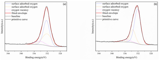 As shown in Figure 9, the oxygen species before modification are mainly lattice oxygen or physically adsorbed oxygen, and there may be more oxygen vacancies. The surface-adsorbed oxygen increased significantly after modification, indicating that nitric acid treatment enhanced the chemical adsorption capacity of oxygen. The oxygen-containing functional groups corresponding to C–O and C = O increased, and oxygen vacancies decreased, indicating that the oxidation reaction filled some defect sites.