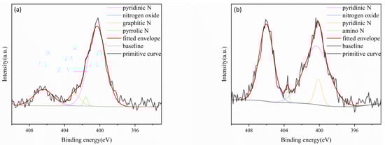 As shown in Figure 10, there are few or no nitrogen species in the unmodified samples. After modification, pyridine nitrogen and pyrrole nitrogen are present. Nitric acid is used as a nitrogen source to form a five-membered ring or six-membered ring structure in the carbon skeleton by doping to provide active sites. There are also amino nitrogen and nitrogen oxides that may be formed by nitric acid oxidation or further reactions of some nitrogen species.