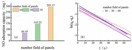 The amount of activated carbon fiber must have an impact on the adsorption effect of pollutants. In order to explore the specific impact effect, the wind speed was determined to be 0.5 m/s, the treatment time was the saturation time of adsorption, the initial concentration was selected to be 43.95 mg/m3, and the number of modified activated carbon fibers was 10, 30, and 60, respectively. The change in the NO adsorption capacity of activated carbon fiber was recorded. The experimental results are shown in Figure 13 and Table 4.
