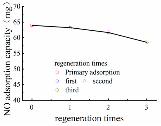 - In the actual industrial tail gas adsorption project, with the increase in the number of regenerations, the adsorption capacity of NO gradually increases. Different from the change in NO adsorption effect in the laboratory, it may be that the laboratory uses pure NO, and the industrial tail gas composition is complex. These substances may provide a better adsorption environment and enhance the adsorption effect through the interaction with the adsorbent. As a result, the adsorption effect of modified ACF on NO is enhanced, or it reacts with NO and some of its components, resulting in the reduction in NO components in the tail gas after detection and purification [21,32].