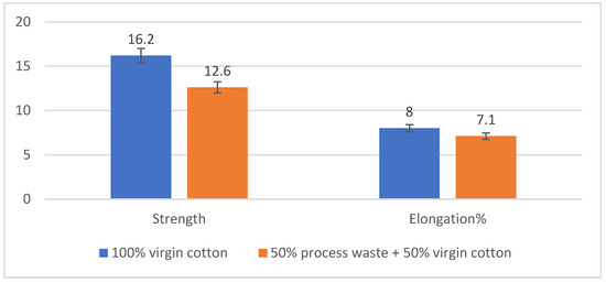 The mechanical properties of yarn, particularly strength and elongation, are crucial determinants of its performance in subsequent textile processes such as weaving and knitting [30]. Figure 1 presents the strength (cN/tex) measurements of the yarns produced, highlighting the distinct difference between those containing 50% process waste and those made entirely from 100% virgin cotton. The results indicate that the yarn made with 50% process waste exhibited a lower strength. This reduction in strength can be traced back to the inherent properties of the process waste, which are generally shorter in length compared to the fibers derived from virgin cotton. Shorter fibers have less effective bonding capabilities, leading to weaker inter-fiber connections during the spinning process. Consequently, this results in a reduction in the yarn’s overall tensile strength. Furthermore, the increased presence of weaker fibers derived from multiple processing cycles may introduce structural discontinuities, thereby negatively impacting the stress distribution across the yarn body.
