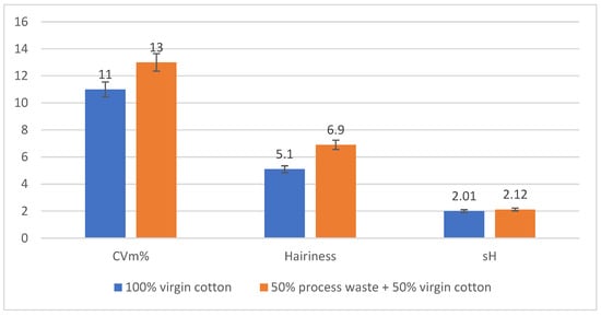 Unevenness in yarn directly influences fabric quality [35]. As indicated in Figure 2, the coefficient of mass variation (CVm%) is higher for yarns containing 50% process waste than those made from 100% virgin cotton. This higher CVm% reflects the irregularities in mass distribution within the yarn, which can be attributed to the challenges in managing short fibers during the drafting phase of spinning. These fibers contribute to the inconsistent thickness and unevenness in the yarn, leading to undesirable variations in mass. Such irregularities can adversely affect the quality and uniformity of the final textile products, pointing to the need for improved processing techniques. This finding suggests the need for enhanced waste-sorting and fiber-blending techniques to improve uniformity in sustainable yarn production.