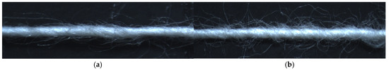 Hairiness is a key parameter affecting yarn aesthetics and fabric performance [33]. Figure 2 reveals the hairiness (H) of the yarns along with its variations (sH). It is observed that yarns composed of 50% process waste exhibit higher hairiness values than those made from 100% virgin cotton (Figure 3). This elevated hairiness can be attributed to the shorter lengths of the process waste, which are less controllable during the yarn manufacturing process. These short fibers tend to protrude from the yarn’s surface, leading to an increase in overall hairiness [34]. An increased hairiness can negatively affect fabric appearance and performance, making this an important factor to consider in the production of yarn from process waste. The control of the fiber length distribution and the improvements in fiber preparation before spinning must be explored to mitigate excessive hairiness.